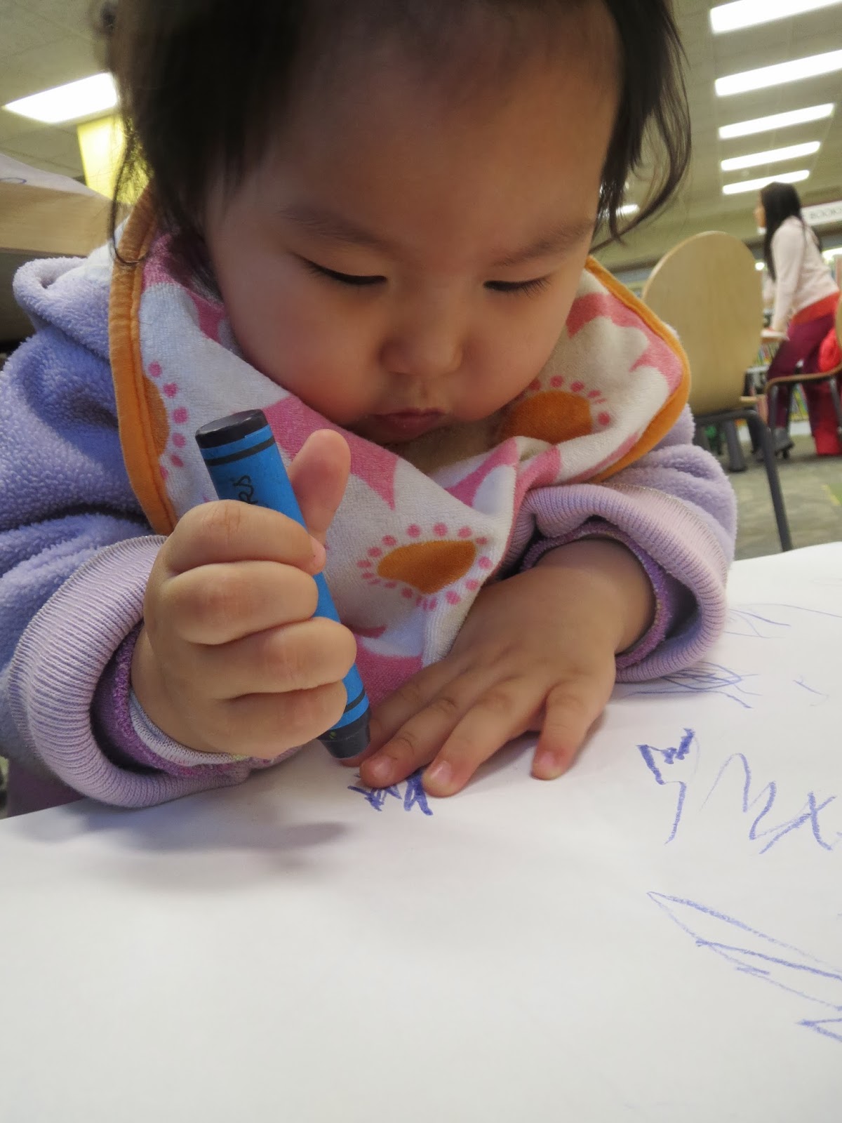 為了不讓 titi 老是在姐姐的作業紙上畫幾筆,我讓她自己站著在小椅子上畫!